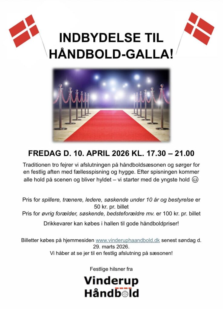 Fredag d. 10. april 2026 inviterer Vinderup Håndbold til gallaaften, som afslutning på håndboldsæsonen 2025/2026. Invitation følger nedenfor.